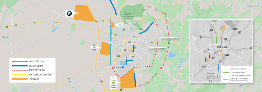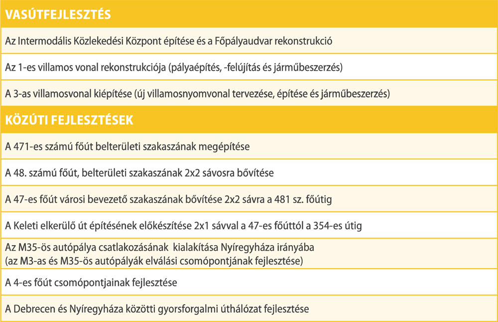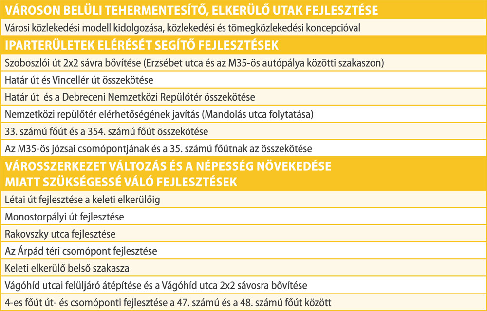 Debrecen a tudatos városi infrastruktúra fejlesztésében kiemelt szerepet szán a közlekedésfejlesztésnek, amelynek révén a régió megkerülhetetlen közlekedési centrumává válik. A közlekedési fejlesztések elengedhetetlenek a jövőbeni lakosságszám-növekedéshez és az egyre növekvő, mobilis munkaerő közlekedési igényeinek kiszolgálásához. A város növekedése indokolja továbbá a városszerkezetbe történő beavatkozást, belső tehermentesítő utak kiépítését, új lakó- és gazdasági területek feltárását, a város keleti elkerülő körgyűrűjének megépítését és a város úthálózatának teljes felülvizsgálatát, szükségszerű átépítését.