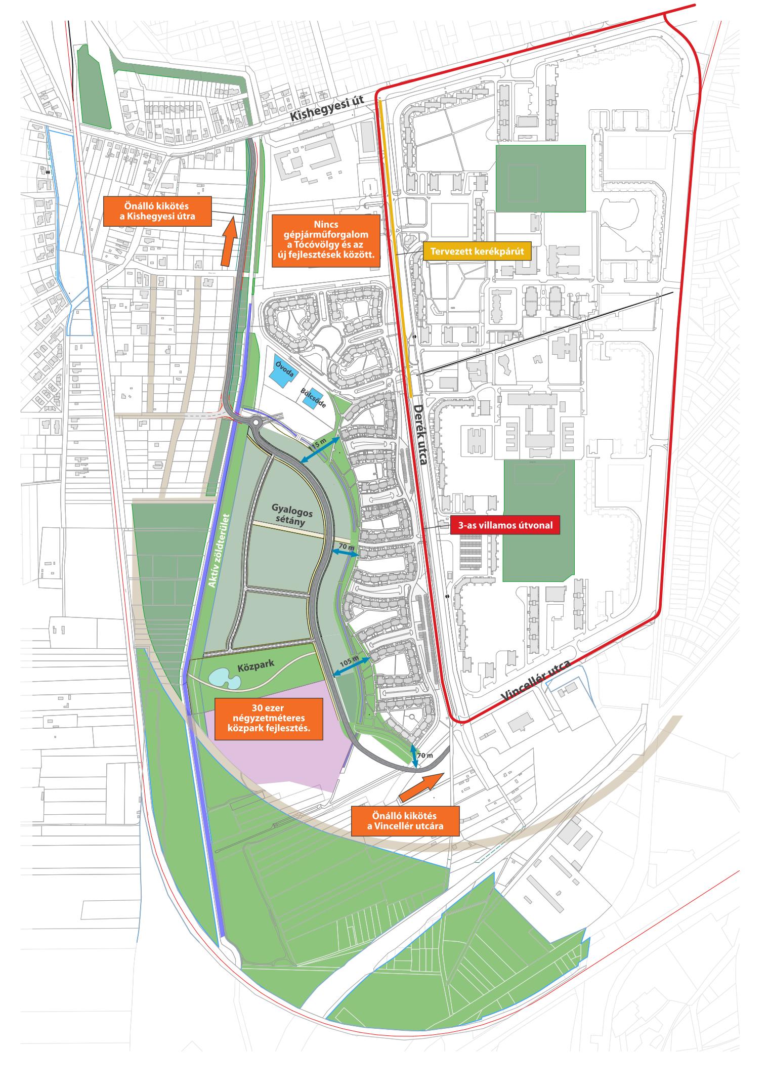 A Tócóvölgy második ütemét két pontot tudjuk csatlakoztatni a város közlekedési rendszeréhez: a Kishegyesi úton, és a Vincellér utcán keresztül az István úton.