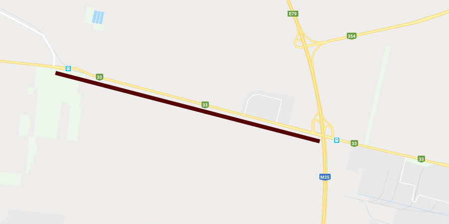 - A 33-as számú főút M35-ös autópálya és 3316. jelű összekötő út közötti szakaszának – 2021. február 28. napjáig – 2×2 sávosra történő kapacitásbővítésével. A 3316-os út a Balmazújvárosra vezető út, a Látóképi csárdánál van a csomópontja a 33-assal. A csomóponttól az M35-ös 4 kilométerre van. Debrecentől az M35-ösig négysávos a 33-as, ott szűkül le kétsávosra.